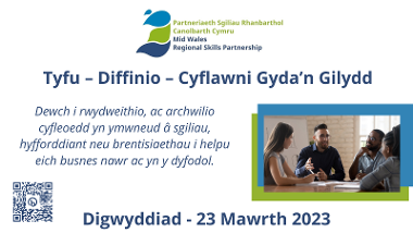 06.03.2023 - Bydd Tyfu - Diffinio - Cyflawni Gyda'n Gilydd, sef digwyddiad ymgysylltu a gynhelir gan Bartneriaeth Sgiliau Rhanbarthol Canolbarth Cymru, yn cael ei gynnal ar fore 23 Mawrth er mwyn rhoi cyfle i chi, busnesau Canolbarth Cymru, ddod at eich gilydd a dweud beth sydd ei angen arnoch ar gyfer y dyfodol i gyflawni nodau eich busnes.